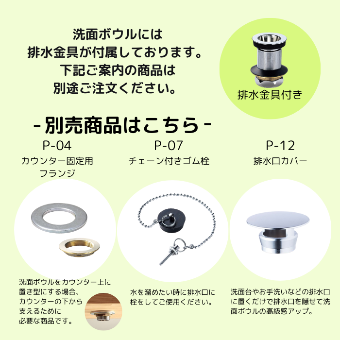 −洗面ボウルと丸型排水栓のセットです。蛇口や排水パイプは付いておりません。