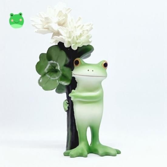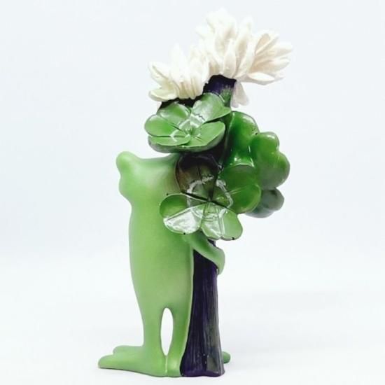 四葉のクローバーを持ったコポタロウ。存在感あるかわいいラッキーアイテムとしてプレゼントにもオススメ。クスッと笑えてカエルや仲間たちの表情やしぐさに癒される小さなインテリアアイテムです。